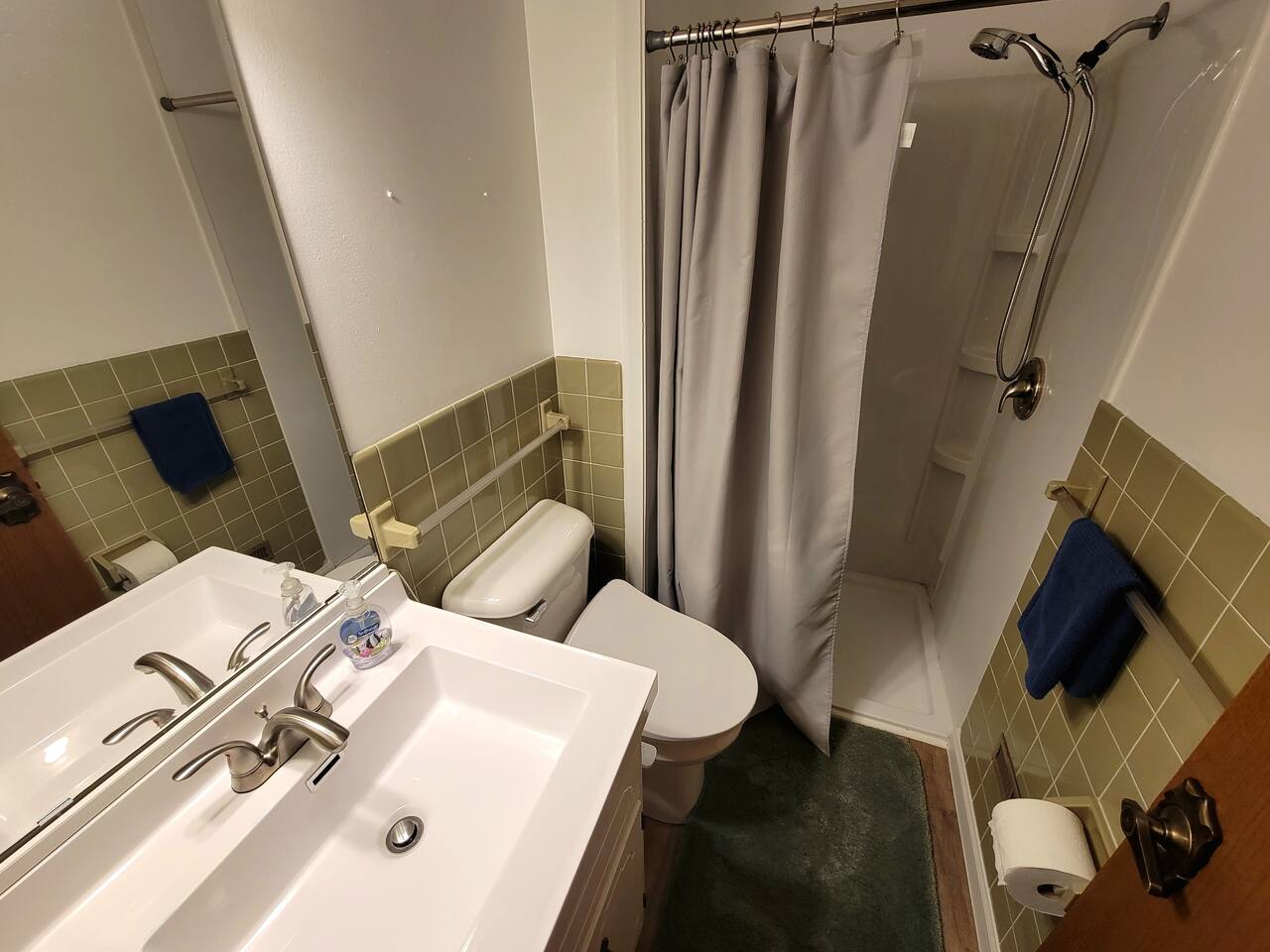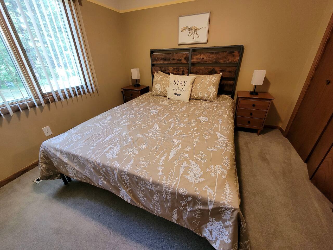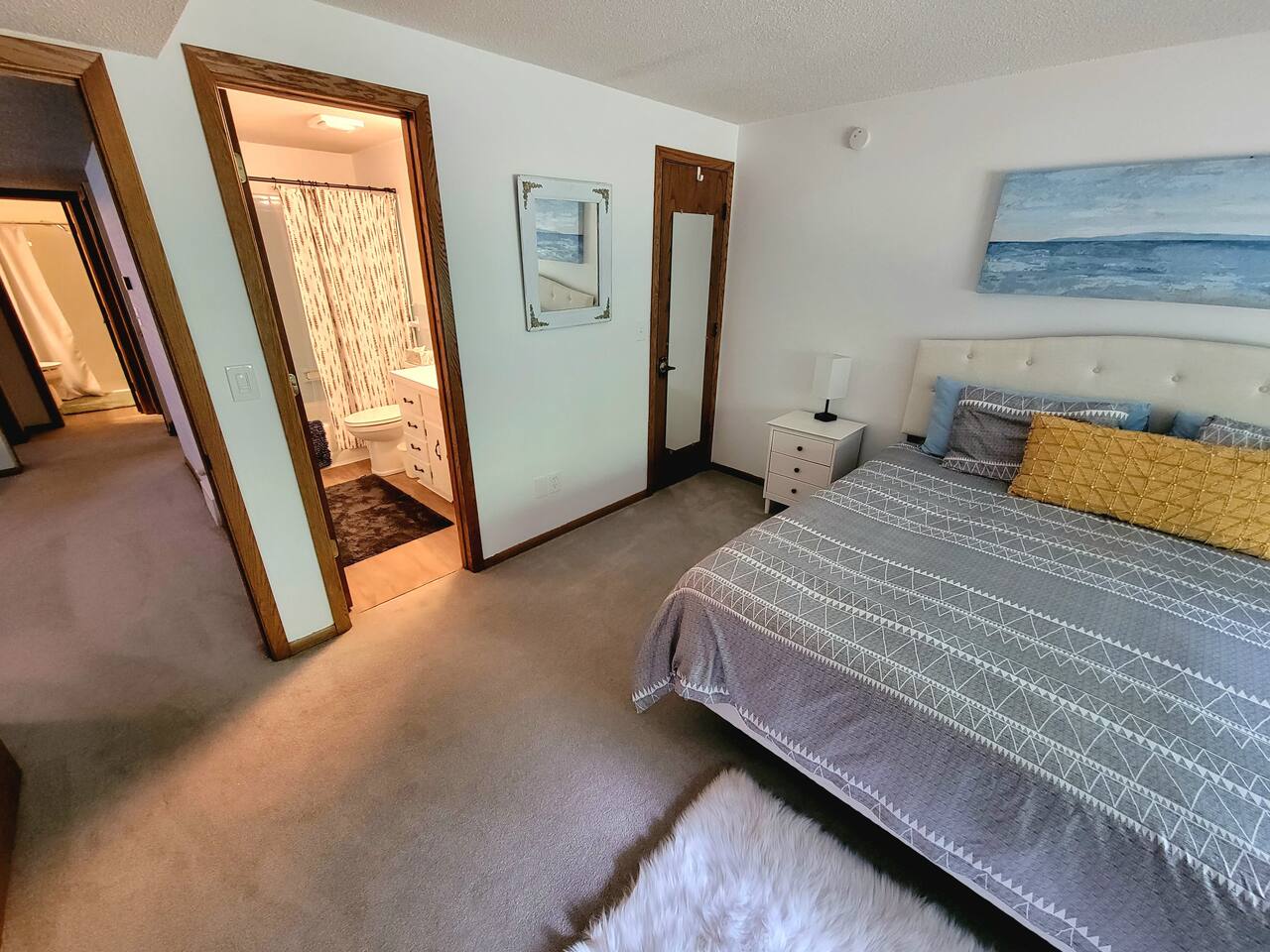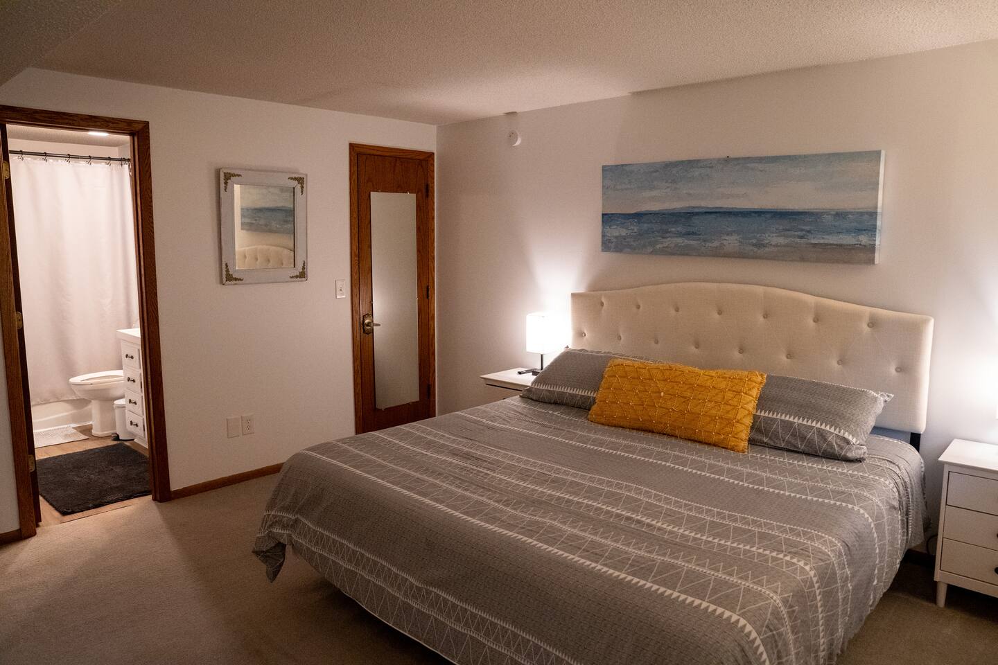 The main floor of this home has a Bedroom with Queen Sized Bed and half bath, along with living room, kitchen & dining room. There is no full bath on the main floor. Downstairs has a main bedroom with king bed and en suite bathroom attached with tub/shower. Additionally there are 2 other bedrooms with queen beds, a bathroom with shower, and free laundry facilities. There is an attached garage with house access as well.