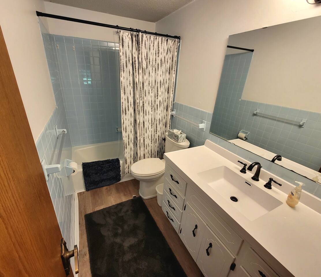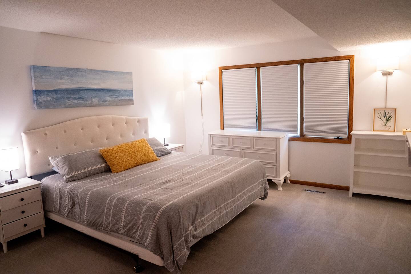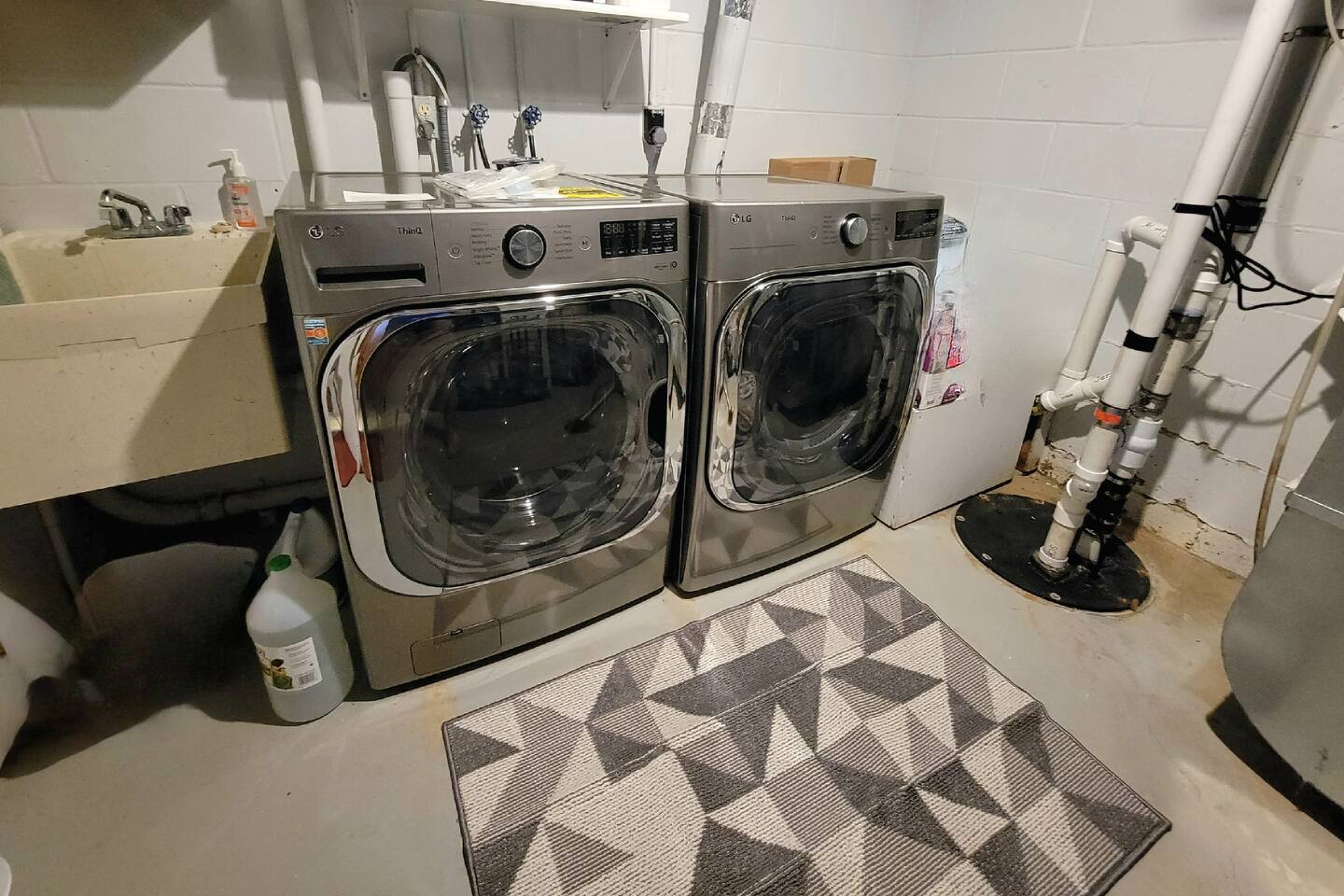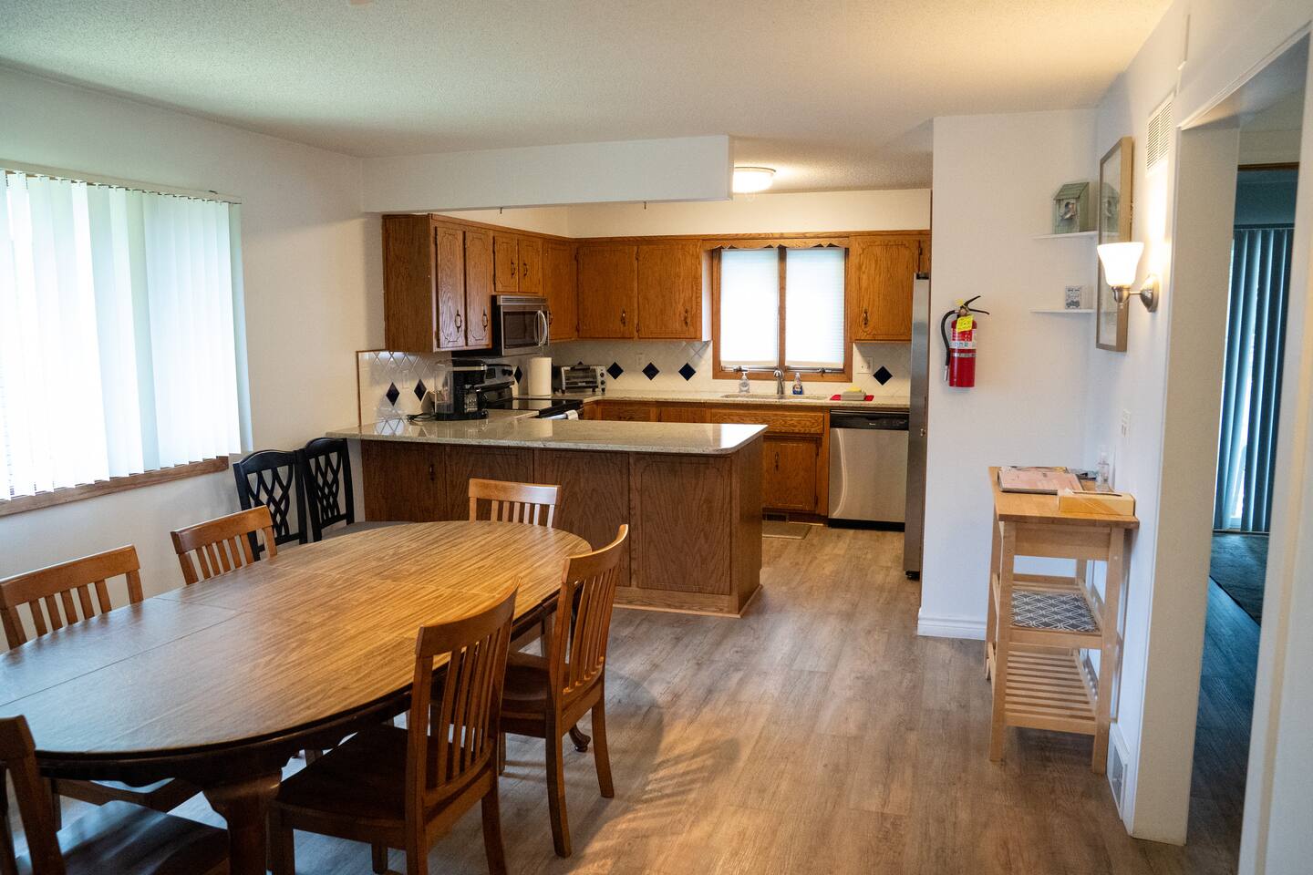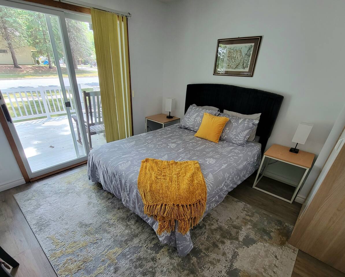 The main floor of this home has a Bedroom with Queen Sized Bed and half bath, along with living room, kitchen & dining room. There is no full bath on the main floor. Downstairs has a main bedroom with king bed and en suite bathroom attached with tub/shower. Additionally there are 2 other bedrooms with queen beds, a bathroom with shower, and free laundry facilities. There is an attached garage with house access as well.