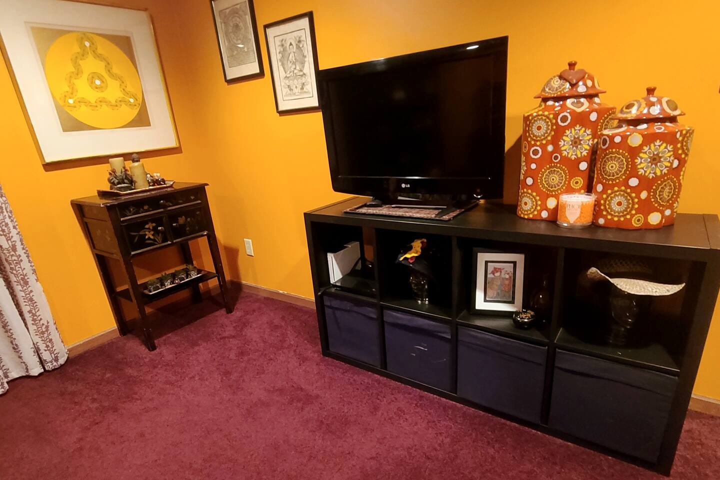 You have a dedicated entrance and your personal space includes a bedroom, living room, bathroom and office. The kitchen, outdoor spaces and laundry room are shared. You will share common spaces with me, my husband, my friendly cat Geronimo & our big goofy dog Tyson.