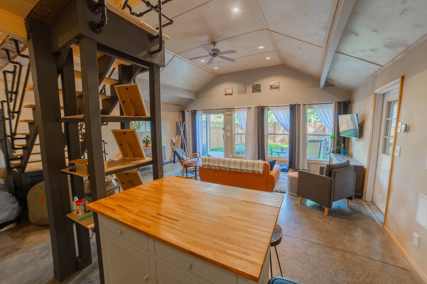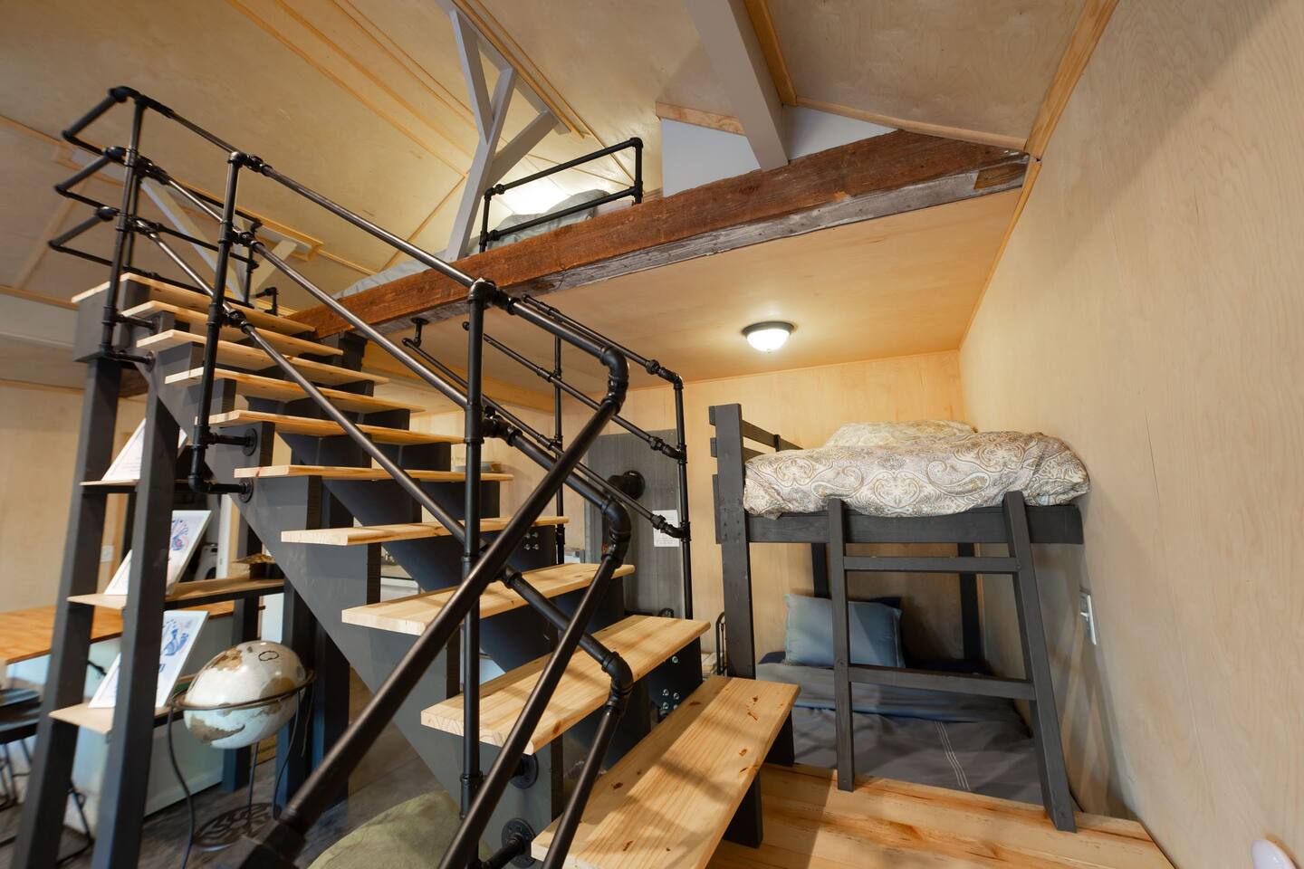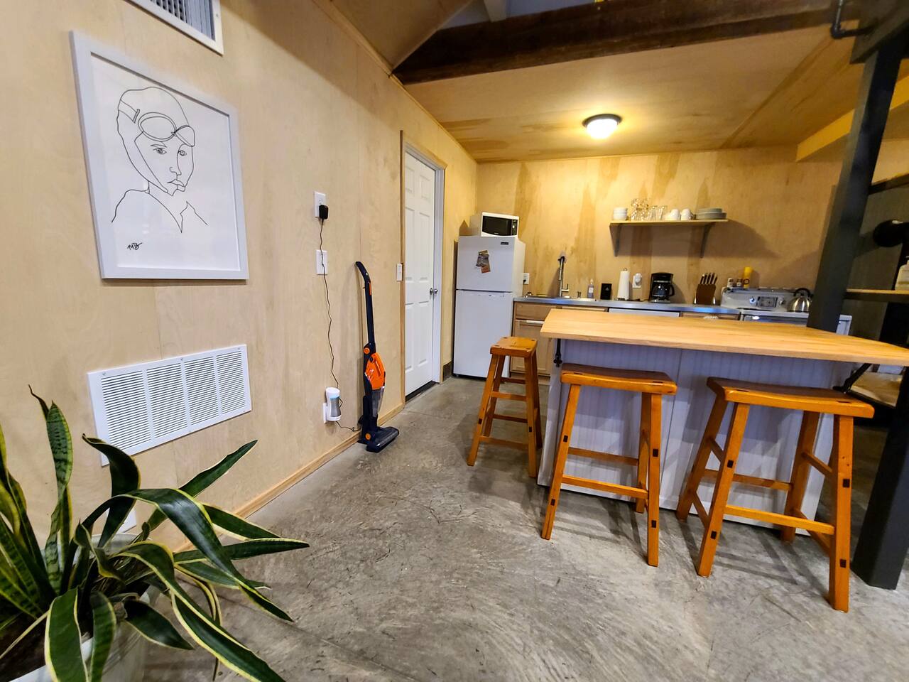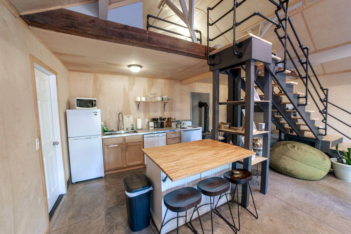 We made every effort to build Hygge into the house whenever we could. This guest house is connected to our garage and was inspired by a similar guest house we stayed in in Sweden. The space has a woodstove for when it's chilly, areas for reading and lounging, as well as comfortable spaces to cook and play a game together. The loft has a King bed and the main area has a twin loft bed and a full size bed that was custom built for the space. There is also a floor mattress that can be pulled out of the bean bag if needed. It features a full washer & dryer, as well as a vintage GE Range & Oven that we traveled over 200 miles to get, a fridge, microwave, drip coffee maker and a dishwasher. It also has wifi, a smart TV, and blackout curtains.