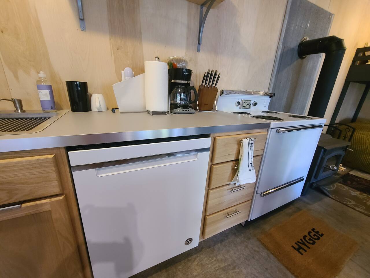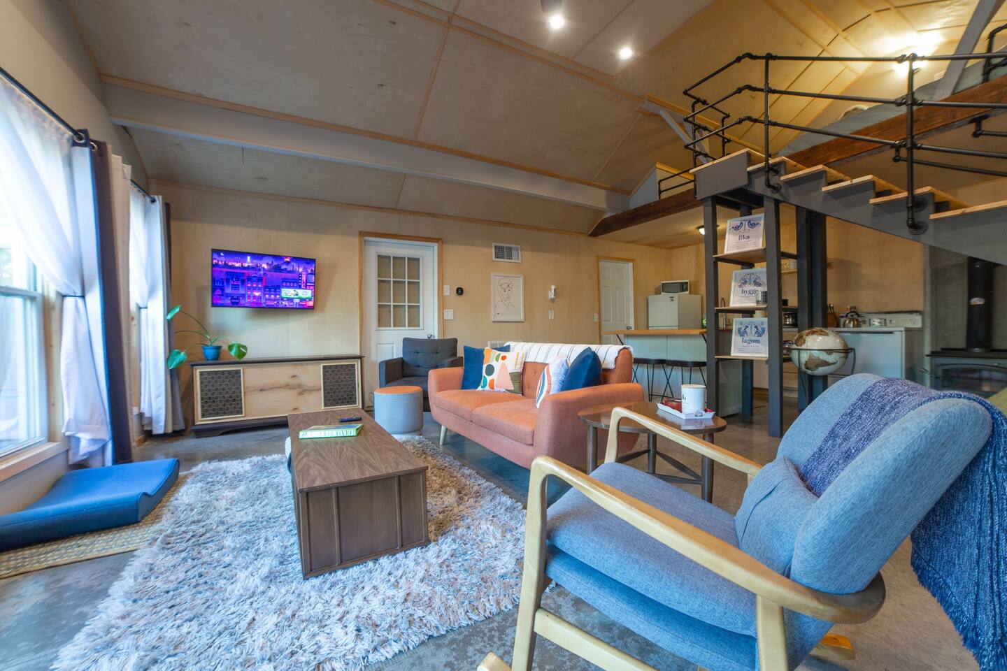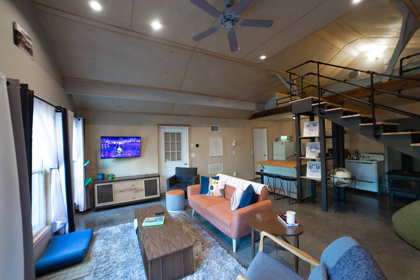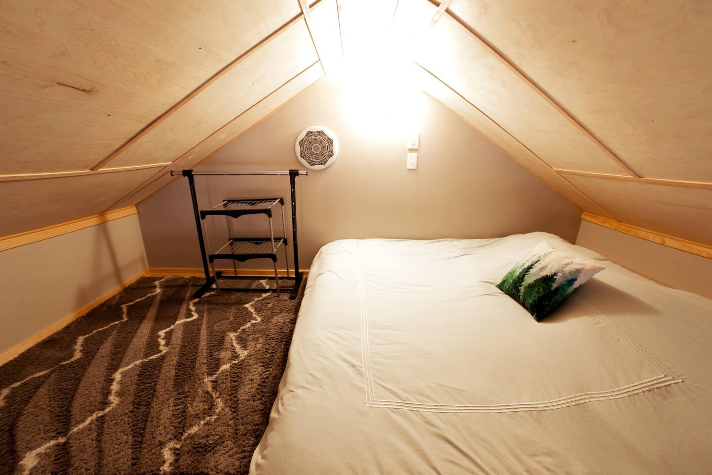 We made every effort to build Hygge into the house whenever we could. This guest house is connected to our garage and was inspired by a similar guest house we stayed in in Sweden. The space has a woodstove for when it's chilly, areas for reading and lounging, as well as comfortable spaces to cook and play a game together. The loft has a King bed and the main area has a twin loft bed and a full size bed that was custom built for the space. There is also a floor mattress that can be pulled out of the bean bag if needed. It features a full washer & dryer, as well as a vintage GE Range & Oven that we traveled over 200 miles to get, a fridge, microwave, drip coffee maker and a dishwasher. It also has wifi, a smart TV, and blackout curtains.
