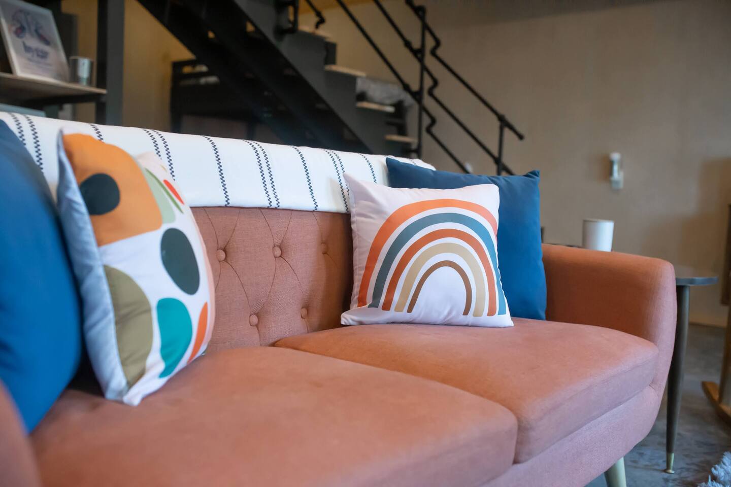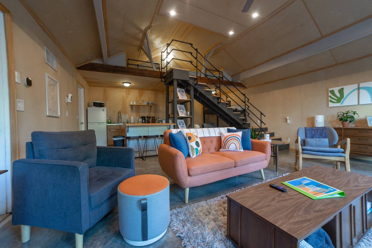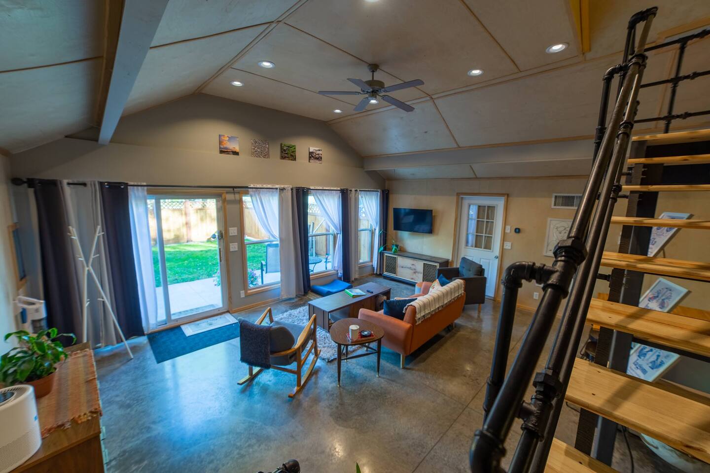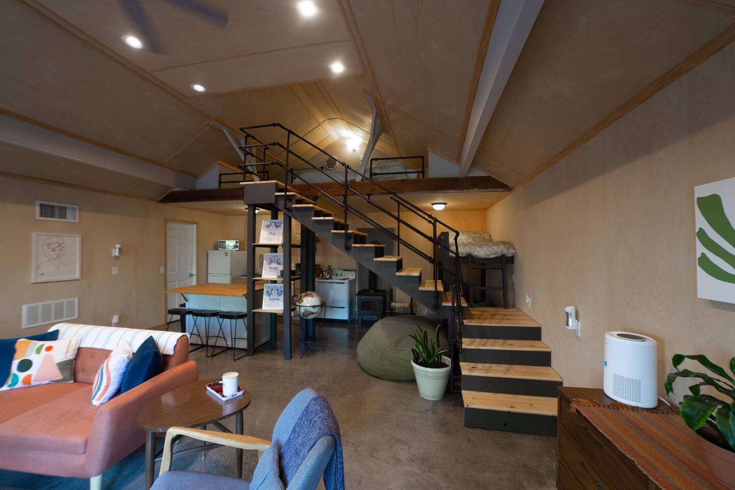We made every effort to build Hygge into the house whenever we could. This guest house is connected to our garage and was inspired by a similar guest house we stayed in in Sweden. The space has a woodstove for when it's chilly, areas for reading and lounging, as well as comfortable spaces to cook and play a game together. The loft has a King bed and the main area has a twin loft bed and a full size bed that was custom built for the space. There is also a floor mattress that can be pulled out of the bean bag if needed. It features a full washer & dryer, as well as a vintage GE Range & Oven that we traveled over 200 miles to get, a fridge, microwave, drip coffee maker and a dishwasher. It also has wifi, a smart TV, and blackout curtains.